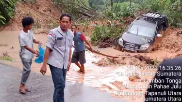 Taput, tvOnenews.com - Satu unit mini bus milik warga diterjang tanah longsor bercampur lumpur di Jalan Lintas Sumatera, tepatnya di Pargarutan, Desa Pangaloan, Kecamatan Pahae Jae, Kabupaten Tapanuli Utara (Taput), Sumatera Utara (Sumut), Rabu (20/12/2023) sore sekitar pukul 16.30 WIB.