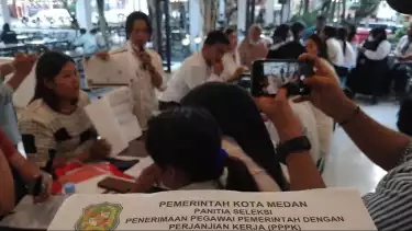 Medan, tvOnenews.com - Ratusan guru yang tergabung dalam Forum Guru Status P Kota Medan menuntut agar pemerintah segera merealisasikan janji pengangkatan menjadi Pegawai Pemerintah dengan Perjanjian Kerja (PPPK). Mereka mengaku kecewa, hingga saat ini belum juga diangkat menjadi PPPK meski sebelumnya sudah dinyatakan lulus dengan status P (Pasing Grade).