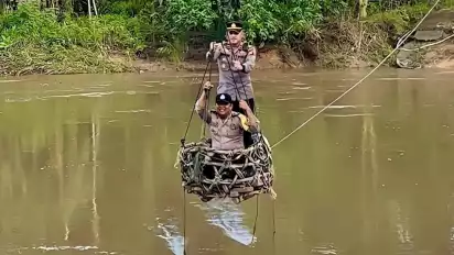Sosialisasikan Pemilu Damai di Desa Terisolir, Personel Polres Rokan Hulu Gunakan Keranjang Terbang