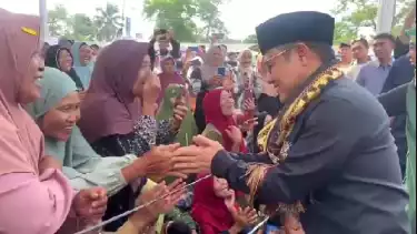 Kedatangan Cak Imin di Lapangan Merdeka Desa Sumbergede, Kecamatan Sekampung, Lampung Timur tersebut disambut antusias relawan dan warga dengan diiringi sholawatan.