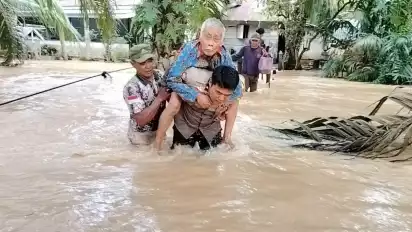 Banjir Rokan Hulu, Petugas Sosialisasi Pemilu Sekaligus Evakuasi 3 Orang Lansia yang Terjebak