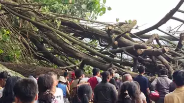 Simalungun, tvOnenews.com - Angin kencang yang melanda sejumlah wilayah di kawasan wisata Parapat, Danau Toba, tepatnya di Kecamatan Girsang Sipangan Bolon, Kabupaten Simalungun, Sumatera Utara, mengakibatkan sejumlah pohon besar tumbang di Jalan Lintas Sumatera (Jalinsum) Sibaganding-Parapat, tak jauh dari pintu gerbang masuk Kota Parapat.