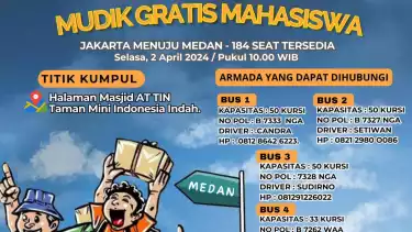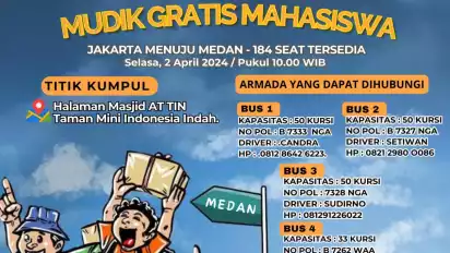 Hadi mengungkapkan, mudik gratis bagi mahasiswa yang difasilitasi Polda Sumut itu dilaksanakan pada 2 April 2024 mendatang dengan titik kumpul di halaman Masjid AT TIN Taman Mini Indonesia Indah.