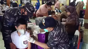 TNI AL Maritim Gelar Serbuan Vaksin 300 Anak SD di Pulau Bangka