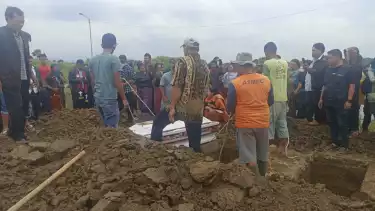 Isak tangis semakin pecah saat peti mati diturunkan ke dalam lubang, terlebih ibu korban yang menangis tepat di sebelah makam para korban. Begitu juga dengan anak korban yang terduduk lemas tepat di atas nisan korban.