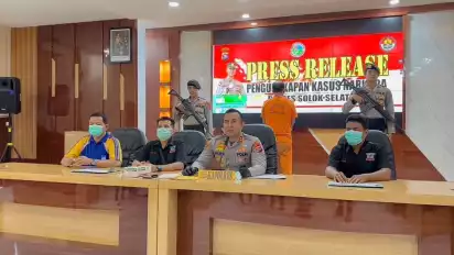 Kapolres Solok Selatan, AKBP Arief Mukhti Surya Adhi Shabara, didampingi Kasat Narkoba, IPTU Roni Surya Putra, dan Kasi Humas, IPTU M Ridwan, menjelaskan tersangka HZ ini ditangkap di Balun Jorong Sawah atau Kecamatan KPGD Muara Labuh.
