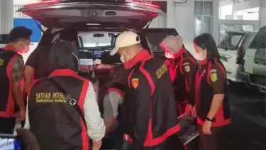 Kemudian, disusul oleh seorang pria memakai rompi merah hitam bertuliskan 'Satuan Khusus Pemberantasan Korupsi' bersama dua orang perempuan berseragam yang sama.