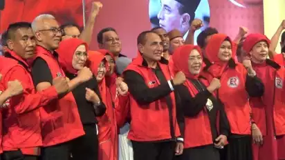 "Lawan dinasti politik, lawan dinasti politik. Sumut Bermartabat, lanjutkan," seru ribuan relawan Edy Rahmayadi Sumut yang hadir di Tiara Convention Center Jalan Madras Hulu, Medan Polonia, Kota Medan, Jumat (16/8/2024).