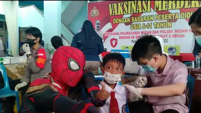 Medan, Sumatera Utara - Pelaksanaan Vaksinasi Merdeka Anak di SD Methodist 6, Jalan Pantai Timur, Kelurahan Cinta Damai, Kecamatan Helvetia, bekerja sama dengan Polrestabes Medan dan Polsek Helvetia, Kamis (20/1/2022) sedikit berbeda. Dua tokoh kartun karakter superhero Spiderman dan Robot Transformers dihadirkan di lokasi guna menarik minat para pelajar.