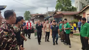 Medan, tvOnenews.com - Calon Gubernur Sumatera Utara nomor urut 2, Edy Rahmayadi dan Hasan Basri Sagala disambut Barisan Ansor Serbaguna (Banser) dan juga putri Bupati Labuhanbatu Selatan Edimin yang juga anggota DPRD Sumut, Darnedi Kurnia Santi saat berkampanye di, Kecamatan Sungai Kanan, Kabupaten Labuhanbatu Selatan, Senin (30/9/2024).