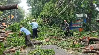 Muaraenim, tvOnenews.com - Akibat cuaca ekstrim yang disertai angin puting beliung, sejumlah pohon tumbang di Kota Muaraenim, titik terparah ada di ruas Jalan Bambang Utoyo atau di kawasan jalan menuju RS HM Rabain Muaraenim yang tertutup total oleh material pohon tumbang, Kamis (24/10/2024).