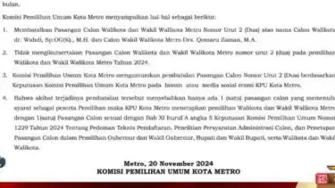 Keputusan ini diambil setelah KPU menindaklanjuti surat dari Badan Pengawas Pemilihan Umum (Bawaslu) Kota Metro (10/11/2024) yang mengacu pada salinan putusan Pengadilan Negeri Kota Metro.