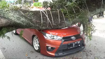 Kondisi macet saat itu menyebabkan dirinya tidak bisa menghindar hingga mobilnya tertimpa pohon.