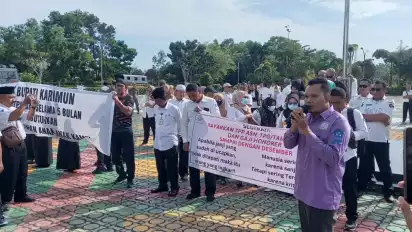 Karimun, tvOnenews.com - Sejumlah Aparatur Sipil Negara (ASN) hingga tenaga pendidik di Kabupaten Karimun, Kepulauan Riau menggelar aksi unjuk rasa di halaman Kantor Bupati, Rabu (8/1/2025) pagi.