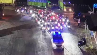 Lampung Selatan, tvOnenews.com - Personel Polres Lampung Selatan, Provinsi Lampung, melakukan pengawalan terhadap ratusan pemudik yang menggunakan kendaraan sepeda motor dari Pelabuhan Wika Beton Bakauheni hingga mencapai perbatasan wilayah.