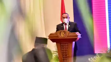 Medan, Sumatera Utara - Gubernur Sumatera Utara Edy Rahmayadi berharap pertumbuhan ekonomi daerah ini menyentuh angka 4,2 persen pada April mendatang. Hal tersebut disampaikan Gubernur Edy Rahmayadi pada upacara Pengukuhan Kepala Perwakilan Bank Indonesia (BI) Sumut Doddy Zulverdi di Kantor Perwakilan BI Sumut Jalan Balaikota, Medan, Jumat (18/3/2022).