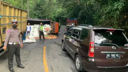 Kepahiang, Bengkulu - Truk dengan muatan sembilan ton gula pasir terbalik di kawasan Tebat Monok, Kabupaten Kepahiang, Provinsi Bengkulu, Jumat (18/3/2022) pagi. Akibatnya lalu lintas Jalan Lintas Tengah Provinsi Bengkulu macet, karena kondisi truk melintang di tengah badan jalan.