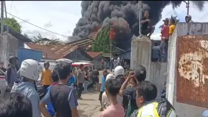 Asap hitam tebal membumbung tinggi di kawasan industri itu. Sementara itu warga juga bergerombol di dekat dan di jalan menuju ke lokasi kejadian.