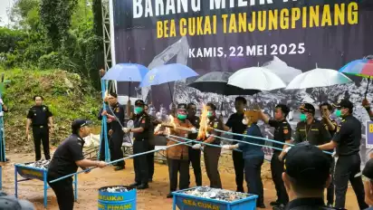 Tanjungpinang, tvOnenews.com - Bea Cukai Tanjungpinang memusnahkan berbagai jenis barang ilegal hasil operasi penindakan selama periode 2024 hingga awal 2025. Pemusnahan dilakukan di Tempat Pengolahan Akhir (TPA) Sampah Jalan Ganet, Tanjungpinang, Kamis (22/5/2025). Aksi ini sebagai bentuk upaya menyelamatkan kerugian negara serta perlindungan masyarakat dampak negatif peredaran barang ilegal.
