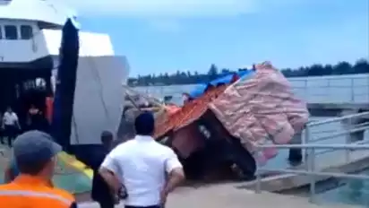 Truk jatuh ke laut saat hendak naik ke dalam kapal. Berdasarkan informasi truk tersebut jatuh ke laut, karena adanya ombak yang menghantam badan kapal.