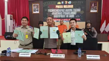 Siak, tvOnenews.com - Tiga pelaku dugaan pemalsuan sertifikat tanah yang telah beroperasi disejumlah desa di Kabupaten Siak diamankan Satuan Reserse Kriminal (Satreskrim) Polres Siak, Rabu (16/7/2025).