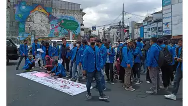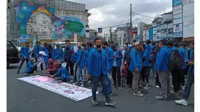 Puluhan mahasiswa tampak berdiri menutupi sebagian jalan sembari berteriak dan membentangkan spanduk tuntutan.