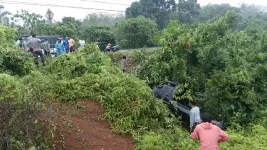 Bungo, Jambi - Sebuah Suzuki Carry Pick Up BH 8298 MJ, terjun ke jurang setinggi 5 meter di Kabupaten Bungo Jambi, saat hujan, Senin (18/4/2022).