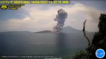 Lalu, Gunung Anak Krakatau mengeluarkan abu vulkanis dengan ketinggian mencapai 2.000 meter di atas puncak arau 2.157 m di atas permukaan laut, sekitar pukul 13:30 WIB. Kolom abu teramati berwarna kelabu hingga hitam dengan intensitas tebal ke arah barat daya. Erupsi ini terekam di seismograf dengan amplitudo maksimum 68 mm dan durasi 56 detik.