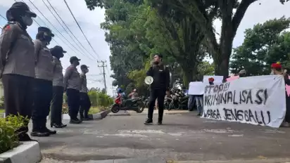 Bengkulu - Puluhan mahasiswa dari Perhimpunan Mahasiswa Katolik Republik Indonesia (PMKRI) dan Ikatan Mahasiswa Papua (IMP) bersama istri petani Desa Jenggalu, Kecamatan Sukaraja, Kabupaten Seluma, Provinsi Bengkulu berunjuk rasa di halaman Pengadilan Negeri (PN) Bengkulu, Senin (18/4/2022).