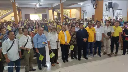 Medan, tvOnenews.com - Anggota Komisi XIII DPR RI Kombes Pol (Purn) Maruli Siahaan bersama Kementrian HAM melakukan sosialisasi Sadar HAM melalui implementasi P5HAM di gedung serba guna HKBP Cinta Damai, Jumat (10/10/2025) sore.