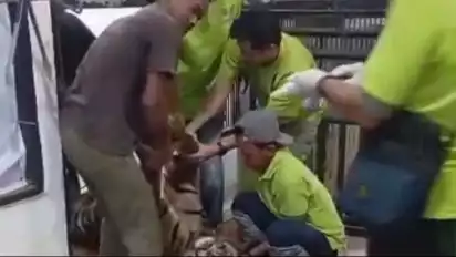“Pada saat proses pemindahan dari kandang angkut ke kandang perawatan di LK Lembah Hijau, satwa berhasil masuk ke kandang perawatan, namun sesaat kemudian, harimau menunjukkan perilaku sangat agresif dengan membenturkan kepalanya ke bagian dinding dan pintu kandang perawatan berulang sebanyak tiga kali," kata dia.