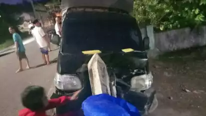 Mobil minibus Daihatsu tersebut menabrak pagar tembok rumah warga di daerah Jorong Kandang Harimau, Nagari Sijunjung, Kecamatan Sijunjung, Kabupaten Sijunjung, Sumatera Barat, Minggu malam (1/5/22).