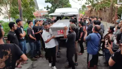 Pematangsiantar, Sumatera Utara - Suasana duka kental terasa ketika jenazah David Siallagan (22) diantar ke rumah duka di Jalan Sarulla, Kelurahan Martimbang, Kecamatan Siantar Selatan, Kota Pematangsiantar, Senin (9/5/22) pukul 17.40 WIB.