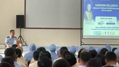 Medan, tvOnenews.com - Ratusan prajurit TNI Angkatan Udara mengikuti kegiatan sharing komunikasi dan motivasi yang digelar di Aula Mustang, Lanud Soewondo Medan. Kegiatan ini menghadirkan pakar komunikasi dan motivasi Aqua Dwipayana, dengan mengangkat tema “Harmoni Keluarga sebagai Fondasi Profesionalisme TNI AU AMPUH.”