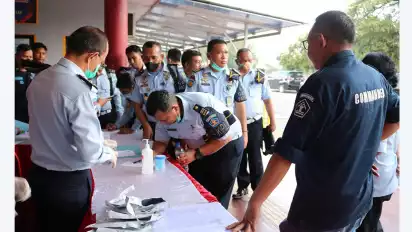 Simalungun, Sumatera Utara - Kunjungi Lapas Klas IIA Pematangsiantar, Sumatera Utara, Direktur Keamanan dan Ketertiban (Dirkamtib) Direktorat Jenderal Pemasyarakatan, Abdul Aris, lakukan tes urine dadakan sejumlah pegawai Lembaga Pemasyarakatan Klas IIA Pematangsiantar, Rabu (25/5/2022).