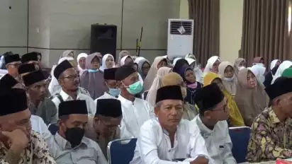 Tebo, Jambi - Sebanyak 101 Calon Jemaah Haji (CJH) asal Kabupaten Tebo menjalani bimbingam manasik di aula kantor Kementerian Agama (Kemenag) Kabupaten Tebo, Jambi. Para jemaah tampak antusias mengikuti arahan dari petugas penyelenggara.