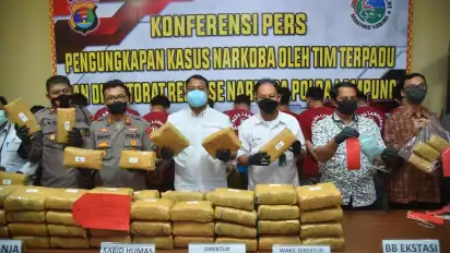 Bandar Lampung, Lampung - Aparat Kepolisian Polda Lampung dan jajaran berhasil membongkar peredaran narkoba lintas provinsi. Pengungkapan peredaran jaringan narkoba lintas provinsi ini, dilakukan Direktorat Narkoba Polda Lampung dalam kurun waktu satu bulan terakhir dengan mengamankan 3 kilogram sabu, 69 kilogram ganja, dan 1.300 butir pil ekstasi.