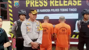 Tebingtinggi, Sumatera Utara - Kapolres Tebingtinggi AKBP Mhd. Kunto Wibisono didampingi Kasat Narkoba AKP Happy Margowatidan Kasi Humas AKP.Agus Arianto, memaparkan kasus penangkapan 50 kilogram ganja kering (50,700 gram) sekaligus 2 kurirnya, Selasa (21/06/2022).