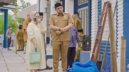 Dengan senyum sumringah, Bobby berjalan bergandengan dengan istri dan ibu kemudian menyempatkan diri menyapa warga yang berada di lokasi.