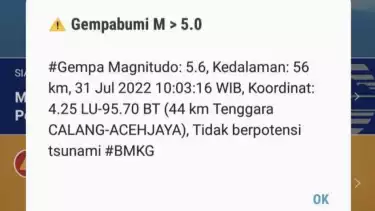 "Gempa bumi ini tidak berpotensi tsunami," kata prakirawan Stasiun BMKG Meulaboh-Nagan Raya Angga Yudha yang dihubungi ANTARA, Ahad (31/7/2022)