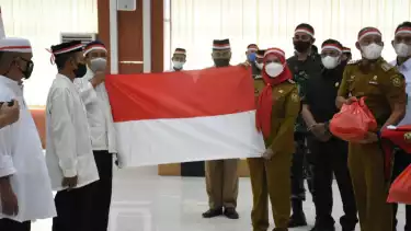Di Aula Semergou Pemerintah Kota Bandar Lampung ditutup dengan penyerahan bendera merah putih dan bingkisan oleh forkopimda kepada 24 orang mantan jamaah Khilafatul Muslimin. (puj/ito)