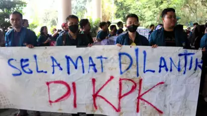 Bandar Lampung, Lampung - Puluhan mahasiswa Universitas Lampung (Unila) yang tergabung dalam Aliansi Mahasiswa Universitas Lampung menggelar aksi demo di depan gedung Rektorat, Senin (22/8/2022). Para mahasiswa ini mengucapkan "selamat dilantik KPK" dalam salah satu spanduk unjuk rasa.