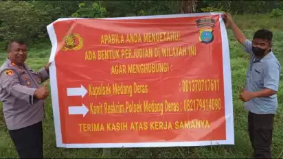 Adapun kalimat dalam spanduk tersebut yakni, "Apabila Anda Mengetahui Ada Bentuk Perjudian di Wilayah Ini Agar Menghubungi Kapolsek Medang Deras 081370717611, Kanit Reskrim Medang Deras 082179414090."