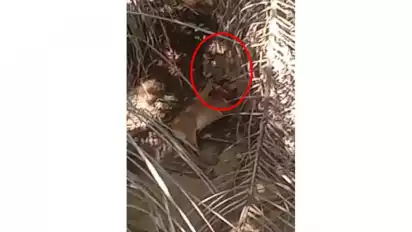 Di dalam persembunyiannya harimau tersebut sedang memangsa seekor lembu yang diduga merupakan ternak warga sekitar.