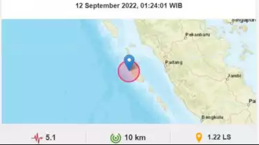 Gempa bumi dengan magnitudo 5,1 terjadi di Kepulauan Mentawai, Sumatera Barat pada Senin (12/9) dini hari.