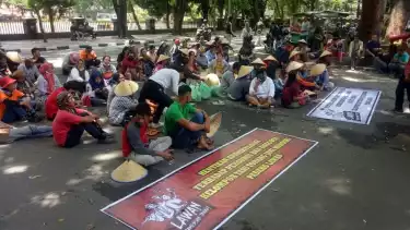 Puluhan petani yang menggelar aksi tampak mengenakan topi dari bambu dan membawa spanduk bertuliskan "Tolak Kriminalisasi terhadap Pengurus dan Anggota Kelompok Tani Torang Jaya Mandiri".