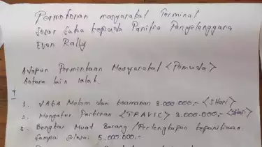 Dalam surat permohonan warga secara tertulis tersebut yang ditujukan kepada panitia dengan total uang sebesar Rp 22.000.000 , dengan perincian biaya pengaturan parkir selama 5 hari Rp. Sebesar Rp 3.000.000.