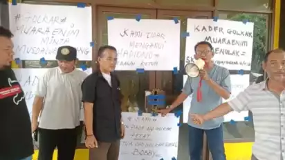 Muaraenim, Sumatera Selatan - Kader pengurus harian DPD Partai Golkar Muaraenim menyegel kantor DPD Partai Golkar Muaraenim. Hal itu dilakukan karena sebagai bentuk penolakan komposisi pengurus DPD Partai Golkar Muara Enim dengan SK Nomor SKEP 146/DPD/GOLKAR-SUMSEL/IX/2022 yang dinilai cacat hukum.