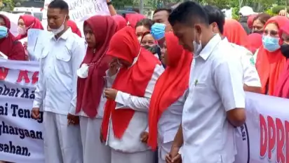 Asahan, Sumatera Utara - Ratusan Tenaga Kerja Sukarela (TKS) yang bekerja di berbagai Puskesmas dan Rumah Sakit di Kabupaten Asahan, Sumatera Utara melakukan aksi unjuk di halaman Kantor Bupati Asahan, Selasa (27/9/2022).