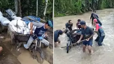 "Untuk bisa melalui jalan berlumpur, kami memasang rantai di ban depan dan belakang agar tidak tergelincir. Jatuh bangun dari motor sudah sering terjadi, alhamdulillah masih selamat," ungkap Apri.